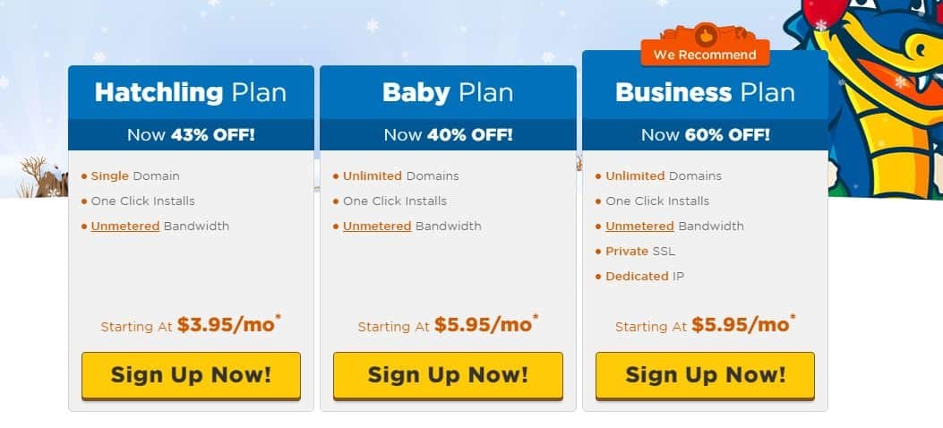 The following is a list of what is available with the Baby plan. Please remember that a Hatchling plan cannot add a second domain for hosting. A small Hatchling plan costs 4 per month which comes out to 95 per month.